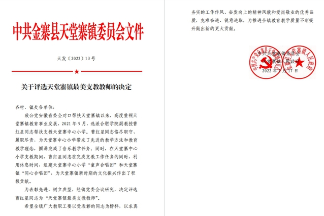我院党员教师曹红星获“天堂寨镇最美支教教师”称号