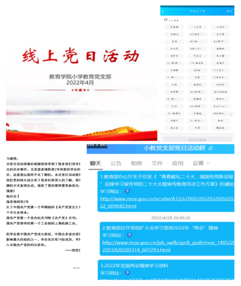 2022年4月28日晚八点,教育学院小学教育党支部组织全体党员通过QQ线上视频开展“持续学习,携手防疫”线上主题党日活动。本次活动由党支部书记王多慈主持,支部党员全员参与。 主题党日“线上”开,党员学习不“断线”。小学教育党支部运用网络平台开展支部主题党日活动,满足了党员的学习需求。与会党员纷纷表示,疫情防控是命令,也是责任,他们深刻认识到做好疫情防控工作的重要性,争当疫情防控的遵守者和舆论传播的引导者,切实发挥青年学生党员的先锋模范作用。(教育学院 童腾平)