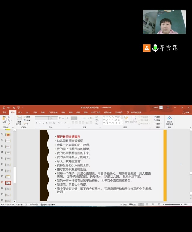 车雪莲老师首先通过三个案例的讲解,给学生展示了智慧型教师的魅力。然后通过智慧型教师的内涵、智慧型教师的成长轨迹、智慧型教师的养成三个层次向学生们介绍了“智慧型教师“,深入阐述了成为一名智慧的师应及时知晓孩子语言、行为、表情等的深层含义。并告诉同学们幼儿教师教书育人就像建房子打地基一样,前期的理论和技能学习,实践锻炼都十分重要。就如幼儿教师要严格履行教师道德誓言,幼儿教师应通过不断学习、不断反思,给孩子做积极地榜样,为千百个家庭培植希望。