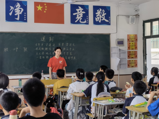 两位老师提前到达教室进行准备,在课堂中逐词逐句地教学生们相应的手语动作:亭子是什么手势、可以用什么姿势表示夕阳山外山、什么动作代表知交半零落......在教“知交半零落”这一句话时,有几位学生默默地将头低下,神情也变得失落了起来。原来,他们是因为想到了自己即将与好友、玩伴分离,昔日里一起交往、共同嬉戏的一幕幕场景在眼前悄然划过,内心埋藏已久的惜别之情也破土而出,甚至有些学生还湿了眼眶。就这样,在这般融洽的学习氛围中,学生们掌握了《送别》整首歌的手语动作,老师也和学生一起录制了这首歌的手语视频,共同身临其境,感受离别之意。