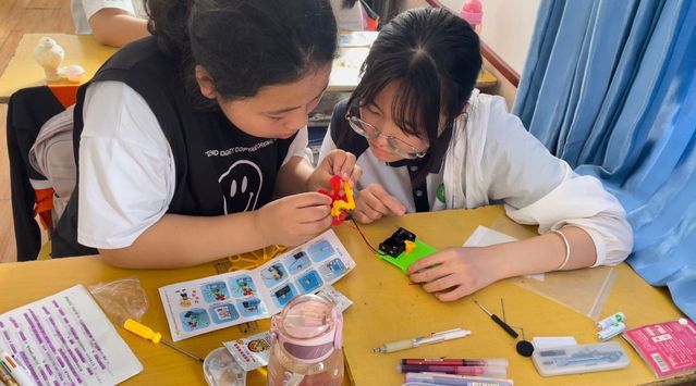 作为教师,也要注重对学生们的创新意识的培养,志愿者们一直秉持着培养学生创新思维的教育理念。当同学们有了新点子时,志愿者们会积极夸奖:“大家看,这位同学做出了会变方向的泡泡,你们知道他是怎么做的吗?”当同学们在操作过程中遇到难题时,志愿者们及时上前询问并给予学生一定指导,同时也会给同学们留够充足的动手时间。“老师,我还想继续上你们的课。”“老师,下节课还是你们的吗?”课下,同学们围住志愿者满怀期待地问道。他们已经在不知不觉中爱上了这节科创课。