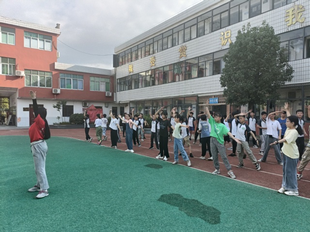 “武舞”融合,刚柔并济 2022年6月22日,合肥学院教育学院三下乡“青春‘育’你行,百年再起航”团队带领合肥蜀山行知学校的六年级二班的同学,在室外开展了《少年中国说》音乐舞蹈活动。 “同学们,这节课我们采用武术和舞蹈结合的方式来开展哦!”听到志愿者的话语,同学们站在操场上纷纷议论起来。“武术和舞蹈怎么结合呀老师?”天真的孩子们疑问连连,志愿者大大方方地走上前去,伴随着音乐为大家表演了完整版的舞蹈。“老师跳的真好看呀!”学生们发出阵阵喝彩。 蓝天白云,红绿操场,同学们在阴凉处随志愿者进行动作学习,一个个全都聚精会神,“武术一定要用力,出拳一定要快”,说着志愿者便帮助身边一位学生摆正了姿势。歪歪扭扭的动作在志愿者走过之后立马变得整整齐齐。志愿者教一段,同学们学一段,认真地学习志愿者老师的动作要领。“叉腰,出拳,身体定住!”口号铿锵有力,同学们斗志昂扬,努力做好每一个动作。“老师,这个手背怎么弯啊?”“老师,怎么摆手的同时转身呀?”他们渴望求学的态度是对志愿者工作的高度认可,也是对本次课的喜爱,炎热的天气也挡不住他们的热情。在休息期间,有的同学还在刻苦练习,主动请教老师如何摆出更好的姿势,去认真体会刚与柔的关系,达到刚柔并济的效果。