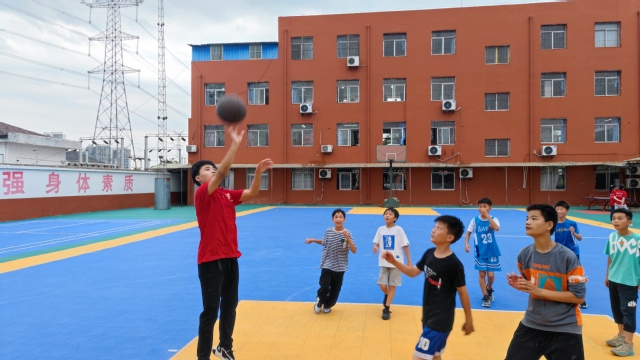 下午最后一节课是五年级二班的室外活动课,结束了一天的炎热,天气开始转凉,同学们运动的欲望大大增加。五年级二班热爱打乒乓球和篮球的同学争先恐后地来到志愿者们日常备课的教室找两位男老师一起打球。同学们手里拿着篮球和乒乓球,簇拥着两位“大朋友”前往操场。两位志愿者根据自己的强项分别和同学们开始不同的运动:一边是屠厚辉带领同学们打乒乓球,另一边则是陈遨地和同学们进行篮球比赛。