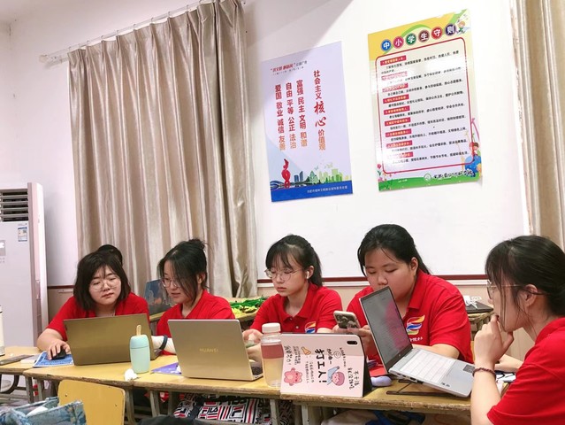 在工作场所方面,学校为志愿者安排了专门的备课室,而在到达学校的第一时间,志愿者们对备课室进行了精心的布置,为接下来一周开展的活动做好准备。每日早上六点半,所有的志愿者都例行在备课室集合,举行简洁的会议,布置当日的任务,活动安排,以及注意事项,会议结束后,志愿者们开启了忙碌的一天。负责授课的志愿者老师在备课室内一遍遍地试讲,主教助教之间相互配合,准备上课材料,商讨上课事宜。其他志愿者们也认真听讲,提出切实可行的建议,力求将课堂效果达到最理想的状态。课下的长时间练习使得部分志愿者们的声音变得有些沙哑,神情疲惫,但是志愿者老师们及时调整,永远以激情昂扬的姿态走进课堂,给学生们带去丰富多彩的活动内容。每一节课程结束后,工作人员总是在第一时间了解相关信息,及时撰写稿件。即使工作任务紧张,但一切活动依旧井然有序地开展着。每个人都在自己的岗位上尽心尽力,以确保实践活动顺利开展,能够给同学们带去他们喜欢的能够学到知识的课堂。