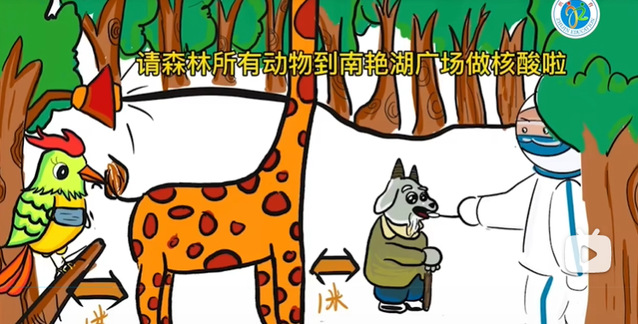 《伸脖子,不要动,啊——》防疫绘本动画小视频是由胡钰婷、汪京京等7名同学组成的团队共同协作完成的。在本次的防疫绘本动画小视频制作过程中,她们结合幼儿的身心发展特点,将绘本中的人物设计成幼儿喜欢的动物形象,并将核酸检测中的规则与动物的特点联系到一起,运用夸张的手法让幼儿更容易理解。例如,老虎做核酸时张大嘴“啊——”,告诉幼儿做核酸时应张大嘴配合采样;乌龟“胆小”不敢伸头做核酸,鼓励幼儿应勇敢做核酸;蜗牛赶路速度“慢”,核酸结束才赶到检测点,教会幼儿应按时按要求做好核酸检测等。该视频从幼儿的角度出发,结合幼儿核酸检测的生活经验,把握幼儿在检测过程中可能会有的“恐惧”心理,用诙谐幽默的手段,教会幼儿核酸检测的要领,让幼儿对待核酸时能做到伸长脖子、不乱动、张大嘴“啊——”,从而能积极配合疫情环境下的卫生防疫工作。
