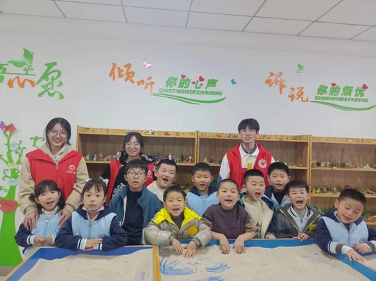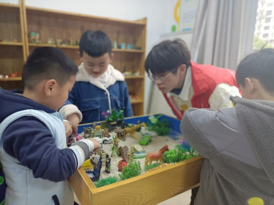 3月20日下午,教育学院阳光心理志愿服务队前往欣园社区为小朋友们开展以“一沙一世界,一盘一未来”为主题的沙盘体验活动。 在活动过程中,心理志愿服务队成员首先让小朋友们选取自己喜欢的沙具并按照自己喜欢的方式摆放,其次作为观察者和陪伴者的身份,帮助小朋友们通过创造沙盘世界、重建沙盘世界等过程,运用沙具发挥自主想象创造沙盘,使小朋友们的内心世界和外界生活得以逐步呈现和自我展示。小朋友们乐在其中,纷纷进行了心与心的交流与感悟,充分体验沙盘游戏带来的魅力。