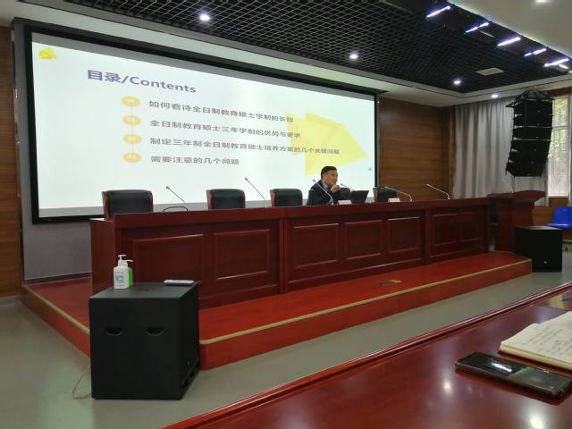 为深入推进学习贯彻习近平新时代中国特色社会主义思想主题教育落实落地取得成效,425日下午230分,沈阳师范大学博士生导师周润智教授应邀来南艳湖校区一期6号楼报告厅为我校师生作了题为“全日制教育硕士培养方案解读”的学术报告。报告会由教育学院和校科研处联合举办,科研处副处长王储炎主持报告会,教育学院领导班子全体成员、硕士点部分导师和该院师生代表近百余人聆听了报告。