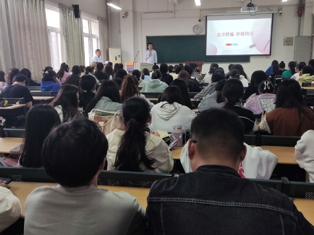 为全面提升学生反诈防骗意识,5月5日,教育学院在善思楼B座107教室举办“反诈防骗、你我同行”主题宣讲会,院党委副书记王迅、学工办主任符琳以及全院各班班长、团支书、寝室长100多人参加宣讲会。