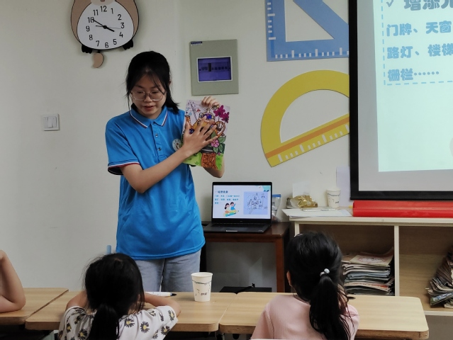 孩子们和志愿者之间的有趣互动使整个教室充满了生机和活力。绘画课上,窗外的阳光斜斜地洒在小朋友的脸上,小朋友们正拿起画笔,跃跃欲试地要在画纸上“大显身手”。志愿者脸上也洋溢着笑容,向孩子们介绍今天的任务:画出“我”的创意房子。同学们便叽叽喳喳地讨论起来,“我要画派大星的房子,扣起来就能睡觉!”“我的房子在云朵上,小鸟帮我看门!”志愿者听到孩子们对自己房子的设想后,鼓励孩子们用五颜六色的画笔勾勒出自己的创意房子。志愿者俯身在桌旁,倾听他们的想法,用鼓励和赞赏的语言表达对每位学生的认可,让孩子们意识到他们的创意独特而有价值。有一个小男孩告诉志愿者老师,他要建一个大大的房子,“很多穷人没有房子,我给他们画房子,这样他们住在里面就不会冷啦。”老师兴奋地点头,说:“你真棒!”当一个个精巧的的房子跃然纸上,仿佛在场的志愿者和学生都感受到了它的温暖。