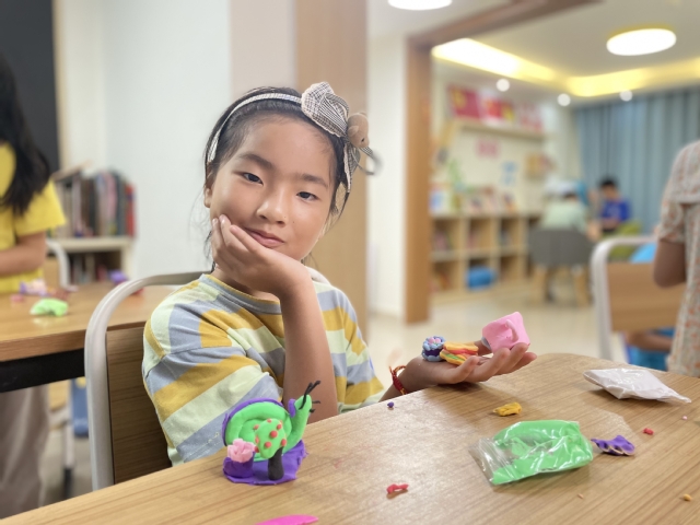 在志愿者带孩子们学习完理论知识后,就到了本节课程最为重要的环节——自己动手用粘土制作美食。志愿者先给孩子们展示了食物的粘土成品,然后在一旁轻声指导,耐心地带着他们逐步制作。志愿者们搓、捏、揉、掐、挑……手指飞舞间,粘土有了大概的雏形。很快,一个个独具特色的作品在孩子们的手中诞生。有的歪歪扭扭,有的大小不一,造型千奇百怪。课程结束后,孩子们兴高采烈地展示着自己的作品。咔嚓一声,相机定格下孩子们开心的笑脸。