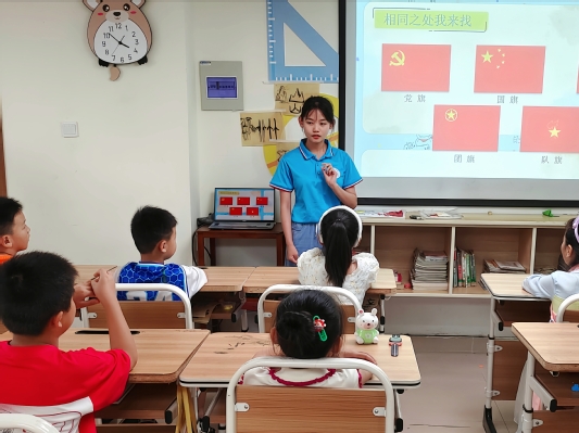 7月9日下午,合肥学院教育学院“七彩童年,‘育’你相伴”志愿团队前往合肥市包河区滨湖和园社区开展“三下乡”社会实践活动。高凡为社区的孩子们带来一堂生动的爱国主义教育课。本次课程的内容主要是让孩子们认识一些重要的旗帜,制作国旗升降台,了解祖国旗帜背后的故事。 “这是五星红旗,是我们的国旗,是我们心中伟大的旗帜……”同学们坐得端端正正,听老师娓娓道来党旗、国旗的含义和由来。新中国的成立离不开革命先辈们的浴血牺牲,每一面鲜红旗帜的背后正蕴含着这些无数可歌可泣的故事。紧接着,一段开国大典的现场视频带着孩子们进入往昔的场景,虽然画质模糊,但当时现场的隆重与庄严的氛围深深吸引了孩子的目光。当五星红旗顺着旗杆缓缓升到天安门上空,在场的人们发出阵阵喝彩,同学们见状也心潮澎湃,激动地鼓起掌来。