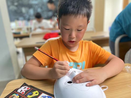 了解脸谱的历史和不同颜色脸谱背后代表的寓意后,志愿老师开始教孩子们自己绘制脸谱。工作人员为大家分发了面具脸谱、颜料、画笔等工具。准备工作完成后,志愿老师详细地给孩子们介绍了京剧脸谱绘制技艺、制作步骤等知识,讲解了不同脸谱的绘画方法,以及如何用画笔勾勒线条、晕染颜色。孩子们用鲜艳的色彩在空白的脸谱胚上绘制纷繁复杂的图案,或是细笔勾勒,或是豪放泼洒,画笔下生出奇思妙想,将京剧传统脸谱与自己的创意相结合。一张张极具孩子们个性特征的京剧脸谱在他们笔下呈现,一笔一画都精细流畅,每个神情姿态都不一样,绚丽多彩,令人赞叹。每个人都在骄傲地展示自己的作品。孩子们将脸谱面具用绳子穿好,戴在自己脸上,学着京剧里的段子有模有样地比划着,教室里一片欢声笑语。孩子们在课下的采访中表示非常喜欢这节课,有趣的脸谱绘制打破了他们对京剧晦涩难懂的传统印象,让他们对非遗文化产生了浓厚兴趣。