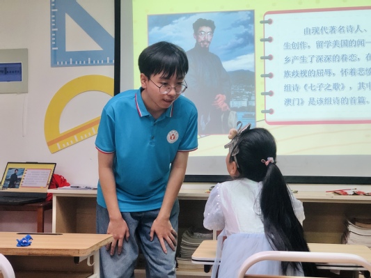 “你可知‘MACUA’不是我真姓,我离开你太久了,母亲……”志愿者娓娓动听的歌声响起,孩子们情不自禁地跟着志愿者打着节拍,轻声歌唱。为了让孩子们领悟这首歌曲背后隽永的情感,更好地学习这首歌,志愿者为孩子们讲解了这首歌曲的创作背景与歌词内容。志愿者告诉孩子们“七子”是当时中国被列强霸占的七块土地,澳门是其中之一,诗人闻一多留学归来,放眼祖国家园,山河破碎,断壁残垣,他愤然写下著名的爱国诗篇《七子之歌》,以抒发七子的孤苦亡告和眷怀祖国的哀忱。听志愿者娓娓道来,孩子们不禁都红了眼眶。山河的破碎、先辈的热血、闪耀的红星都仿佛出现在眼前。