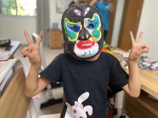 了解脸谱的历史和不同颜色脸谱背后代表的寓意后,志愿老师开始教孩子们自己绘制脸谱。工作人员为大家分发了面具脸谱、颜料、画笔等工具。准备工作完成后,志愿老师详细地给孩子们介绍了京剧脸谱绘制技艺、制作步骤等知识,讲解了不同脸谱的绘画方法,以及如何用画笔勾勒线条、晕染颜色。孩子们用鲜艳的色彩在空白的脸谱胚上绘制纷繁复杂的图案,或是细笔勾勒,或是豪放泼洒,画笔下生出奇思妙想,将京剧传统脸谱与自己的创意相结合。一张张极具孩子们个性特征的京剧脸谱在他们笔下呈现,一笔一画都精细流畅,每个神情姿态都不一样,绚丽多彩,令人赞叹。每个人都在骄傲地展示自己的作品。孩子们将脸谱面具用绳子穿好,戴在自己脸上,学着京剧里的段子有模有样地比划着,教室里一片欢声笑语。孩子们在课下的采访中表示非常喜欢这节课,有趣的脸谱绘制打破了他们对京剧晦涩难懂的传统印象,让他们对非遗文化产生了浓厚兴趣。