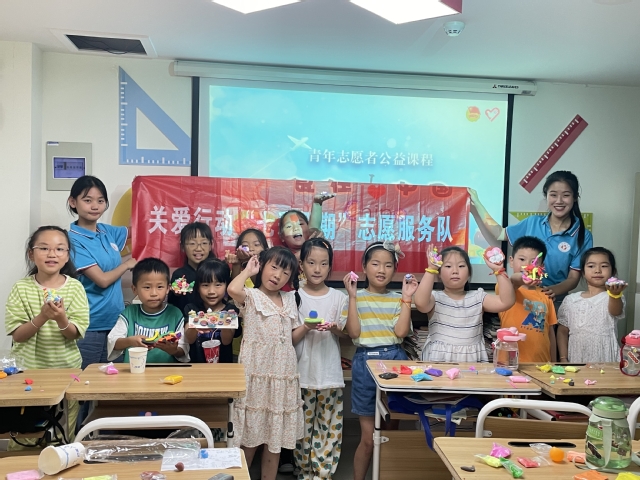 在志愿者带孩子们学习完理论知识后,就到了本节课程最为重要的环节——自己动手用粘土制作美食。志愿者先给孩子们展示了食物的粘土成品,然后在一旁轻声指导,耐心地带着他们逐步制作。志愿者们搓、捏、揉、掐、挑……手指飞舞间,粘土有了大概的雏形。很快,一个个独具特色的作品在孩子们的手中诞生。有的歪歪扭扭,有的大小不一,造型千奇百怪。课程结束后,孩子们兴高采烈地展示着自己的作品。咔嚓一声,相机定格下孩子们开心的笑脸。