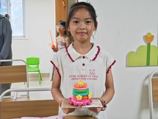 团队成员为孩子做的彩色“黏土蛋糕”点缀了这个特别的日子。庆生活动的开始,团队成员朱思宇和周琴就拿出了提前用超轻粘土精心制作好的手工彩色蛋糕。在成员出色技艺下,这个蛋糕被制作得更为精致巧妙。她们还别出心裁地在蛋糕的最上方捏了一个小朋友喜欢的“蛋仔”玩偶,使得整个粘土蛋糕看起来更加灵动且充满了人情味。