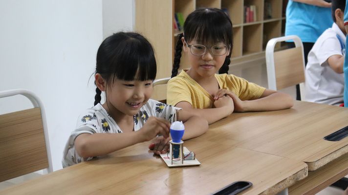 兴趣的种子在孩子们的心中生根发芽,他们对于科学的热情一触即发。在阐述发电原理时,老师通过“实验+讲解”的方式,鞭辟入里地向孩子们介绍其工作定律和电能产生的原因。孩子们也在老师的讲解下,认真地进行着手摇发电机的制作。最终,在老师的耐心指导下,孩子们完成了手摇式发电机的制作。随着孩子们摇动手柄,发电机上的灯泡发出荧荧之光,孩子们惊叹于科学实验的神奇之处,更被科学的无穷魅力所吸引。“做中学,做中教,做中求进步”是陈鹤琴先生的教育理念,也正是这节别开生面的科学课所秉持的方法论。坚持孩子们的主体地位和教师的主导作用,让孩子们通过自己的动手操作,建立与事物之间的联系,逐步掌握知识,形成概念,发展能力,培养科学兴趣与科学素养。这节妙趣横生的科学课无疑打开了孩子们触摸科学、爱上科学的窗口。