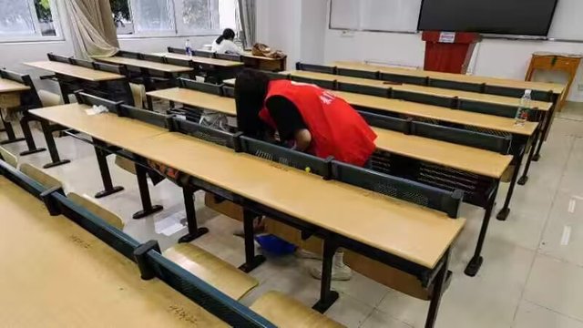图一:同学们打扫艺术楼 志愿者们充分发挥了团队合作精神,互相帮助,共同完成任务。在清洁过程中,不怕脏、不怕累,他们的认真态度和付出,让整个艺术楼和教学楼焕然一新,为同学们创造了一个干净舒适的学习环境。
