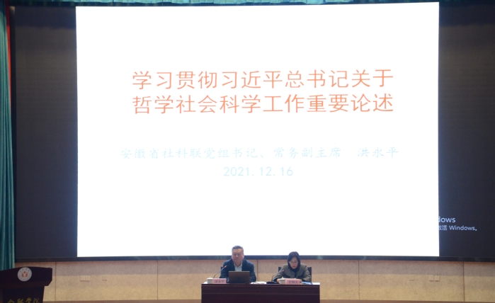 12月16日上午,我校于图书馆报告厅A厅举办“南艳湖讲堂”第三讲,特邀安徽省社科联党组书记、常务副主席洪永平来我校作题为《学习贯彻习近平总书记关于哲学社会科学工作重要论述》的专题报告,校长吴春梅、党委副书记刘建中出席报告会,相关职能部门负责人、合肥学院社会科学界联合会会员、新当选的合肥学院社科联第二届委员会委员、各二级学院分党委宣传委员、哲学社会科学类专业学生代表等到场聆听,会议由吴春梅主持。