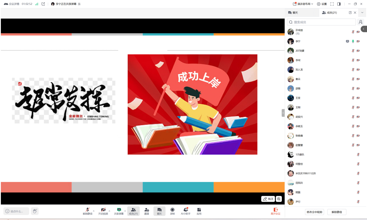 为助力毕业生科学规划职业发展,2025年8月30日上午,数学与统计学院成功举办考公经验线上交流会。会议特邀2025届应用统计学专业谢乐、刘健两位校友进行经验分享。学院党委书记王磊、副书记章云冉、副院长李宁以及2023级数学专业全体研究生参加交流会。会议由李宁主持。