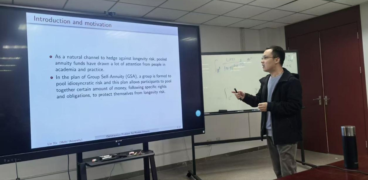 解淋博士作了题为“部分信息下的池化年金鲁棒投资与消费”的学术报告。报告将部分观测与鲁棒偏好纳入池化年金的消费—投资模型,系统分析了退出灵活性与信息质量对最优策略和福利的影响。数值结果表明,模型不确定性与退出机制对福利具有显著影响,其在资产配置中的重要作用。