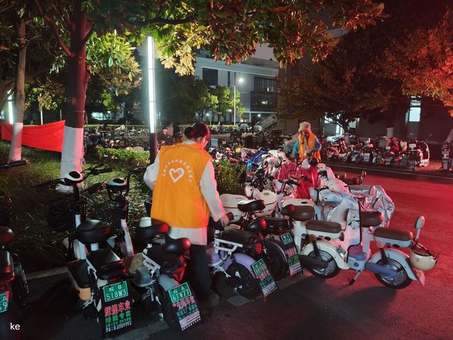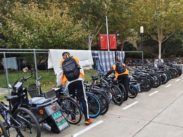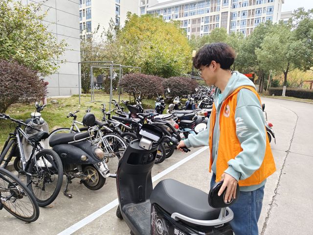 在校园的一些停车点附近,随处可见生物院志愿者们忙碌的身影。他们将那些随意停放的自行车和电动车整理摆放在合适的停车点,将不小心倒下的车辆扶正。在他们的努力下,宿舍楼下原本杂乱的停车区变得井然有序。同学们的出行变得更加畅通无阻,不再需要从混乱的车堆中艰难前行。消除了车辆乱停可能导致的安全隐患,为校园营造了更加安全和谐的环境,同时为校园文明建设献出了一份自己的力量。