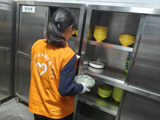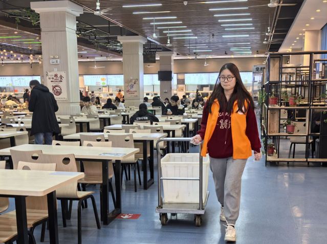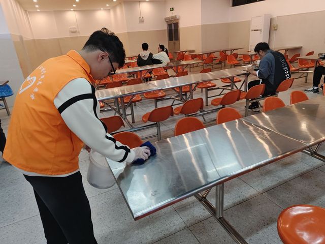 在食堂的卫生保障工作中,志愿者们发挥着重要作用。每日中午和晚上的用餐高峰时段,他们便活跃于餐具回收处,积极宣扬“光盘行动”理念,大力倡导节约粮食,提醒同学们按需取餐,避免浪费。同时,志愿者们还自发地清理餐桌,将用过的餐具整理归类,为后续的清工作提供便利。他们耐心引导同学们文明排队,有序就餐,有效维护了食堂的用餐秩序。在志愿者们的努力下,食堂环境得到了显著改善,同学们也能在整洁、有序的氛围中享受用餐时光。