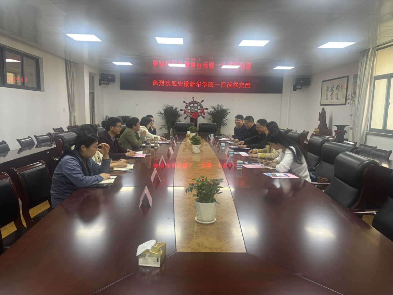 2025年3月25日下午,安徽新华学院药学院执行院长黄德垚、安徽新华学院城市建设学院副院长(主持工作)汪青、安徽新华学院城市建设学院副院长罗月颖等一行来我院交流硕士研究生联合培养工作,我院党委书记李秀娟、副院长笪春年、副院长陈俊以及各硕士点负责人参加了交流会议。