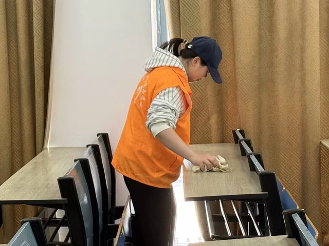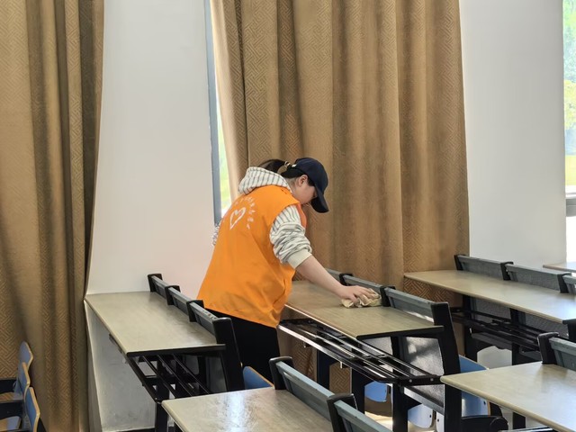 活动开始前,各负责人对参与人员进行了详细的任务分配。在清扫过程中,大家分工明确、配合默契。同学们手持扫帚、抹布等清洁工具,穿梭在教室、走廊和楼梯间,认真擦拭着桌椅、门窗,清扫地面的垃圾,不放过任何一个卫生死角。他们不怕脏、不怕累,以饱满的热情投入到清扫工作中,展现出良好的精神风貌和团队协作能力。经过两个小时的努力,三十五栋教学楼的公共区域焕然一新。教室里桌椅摆放整齐,地面干净整洁;走廊和楼梯也变得宽敞明亮,空气中弥漫着清新的气息。