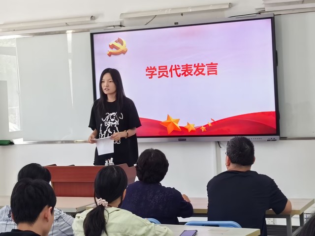 典礼伊始,全体人员肃然起立,奏唱中华人民共和国国歌。激昂的旋律回荡在教室中,激励着每一位学员肩负起时代赋予的责任与使命,为国家的繁荣富强不懈奋斗,也为接下来的学习之旅奠定了坚实的思想基础。随后,阮班锋上台发表讲话。他强调了入党分子培训班的重要意义,指出此次培训不仅是学员们提升政治理论素养的契机,更是他们向党组织靠拢、接受党性教育的关键一步。他希望学员们能够珍惜此次学习机会,以饱满的热情和严谨的态度投入到培训中,努力提升自身素质,争取早日成为一名光荣的中国共产党党员。学员代表随后上台发言,表达了全体学员对此次培训的期待与决心。学员代表表示,大家将严格遵守培训纪律,认真学习党的理论知识,积极参与实践活动,不断提升自己的党性修养和政治觉悟,以实际行动践行入党初心。赵暮雨在典礼上介绍了本次培训的学习内容安排。她指出,培训内容将分为理论学习、实践锻炼和自主学习三部分。理论学习将系统讲解党的基本理论、基本路线和基本方略;实践锻炼将通过实地参观、志愿服务等形式,让学员们在实践中感悟党的宗旨;自主学习则鼓励学员们利用课余时间深入研读党的经典著作,拓宽知识面,提升综合素养。