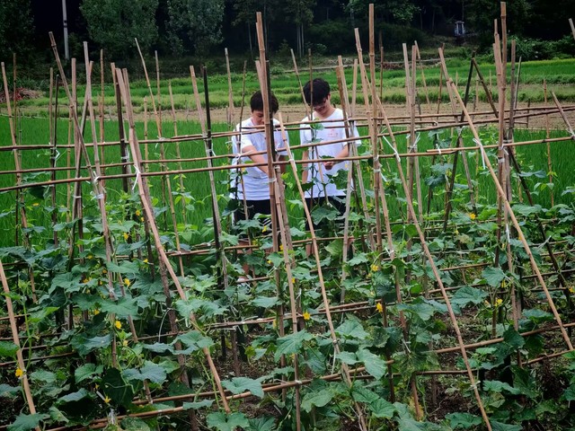 图为调研团成员近距离观察黄瓜,了解其生长态势