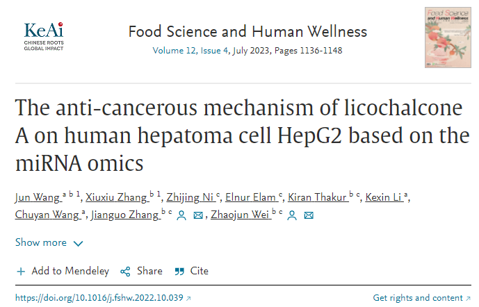 近日,我校生物食品与环境学院食品科学专业青年教师王郡博士在国际食品科技研究领域顶级期刊《FoodScience and HumanWellness》(食品科学与人类健康)(IF2022=8.022,中科院农林科学Q1,食品科技Q1)在线发表了研究论文,该论文的题目为《Theanti-cancerous mechanism of licochalcone A on human hepatoma cellHepG2 based on the miRNAomics》(基于miRNA组学研究甘草查尔酮A对人肝癌细胞HepG2的抗癌机制)。该研究在miRNA组学水平上解析甘草活性成分——甘草查尔酮A对人肝癌细胞HepG2的抗癌作用,为清晰认识到甘草的营养价值和药理学作用提供了新的视角。