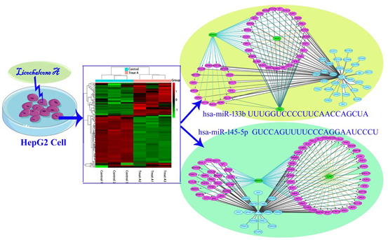 本研究利用团队前期建立的miRNA组学技术,尝试在miRNA组学水平上揭示甘草查尔酮A对人肝癌细胞HepG2的抗癌作用机制。甘草查尔酮A处理HepG2细胞后,共鉴定出102个DE-miRNA,其中SP1被认为是调控DE-miRNA的主要转录调控因子。对DE-miRNA的靶基因进行预测和富集通路分析,发现FoxO通路是核心富集通路。通过构建miRNA-靶基因调控网络鉴定出关键DE-miRNA(hsa-miR-133b和hsa-miR-145-5p),并进一步构建关键DE-miRNA-靶基因-转录因子的三级调控网络,在miRNA水平阐明甘草查尔酮A对人肝癌细胞HepG2的抗癌作用机制。