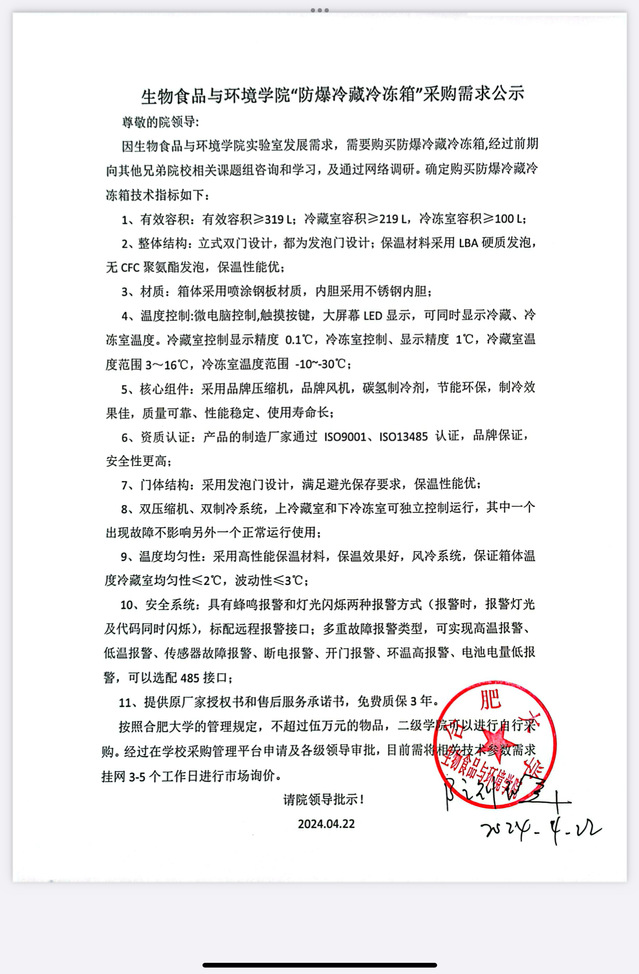 生物食品与环境学院“防爆冷藏冷冻箱”采购需求公示