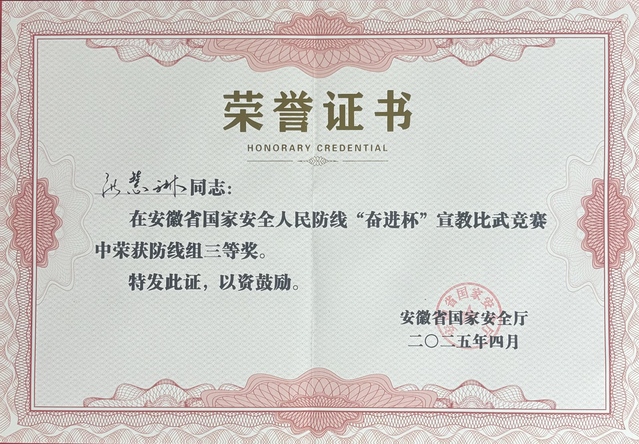 近日,首届安徽省国家安全人民防线“奋进杯”宣讲比武竞赛圆满落下帷幕。我院教师张惠琳凭借扎实的理论知识和出色的现场表现,荣获防线组三等奖。