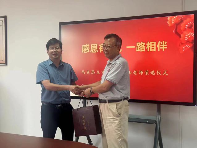 马克思主义学院举行退休教师荣休仪式为增强退休教师的成就感、幸福感和荣誉感,充分体现对退休教师的关怀,进一步激发全院教师爱岗敬业、恪尽职守的热情,8月30日下午,马克思主义学院全体教师齐聚一堂,在会议室举行姜从山老师的荣休仪式。马克思主义学院院长陈志超、马克思主义学院副院长苏冰及学院全体教师参加,仪式由副院长苏冰主持。 仪式上,副院长苏冰首先介绍了姜从山老师37年教书育人的工作历程和十几年热心公益、无私奉献的大爱行动,对姜从山老师为学院、学校和社会做出的贡献表达了深深的敬意。 院长陈志超向姜从山教师为学院和学校发展作出的贡献表示了真挚感谢,并高度赞扬了姜老师投身公益、大爱无疆的奉献精神和热忱之心。强调姜老师不仅做好教师的本职教育工作,兢兢业业,站好三尺讲台,讲好思政课,更是在生活中弘扬伟大的奉献精神,12年来累计捐献血液38200毫升,累计志愿服务时长3000多小时,荣获全国无偿献血奉献奖终身荣誉奖、全国无偿献血奉献奖金奖和安徽省教科文卫体系统师德先进个人、合肥好人等称号。陈志超院长动情指出,老教师是马克思主义学院的宝贵财富,也是青年教师奋发向上不断学习的榜样,呼吁青年教师学习姜老师的优秀品质。