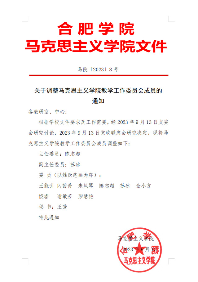 关于调整马克思主义学院教学工作委员会成员的通知
