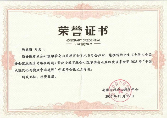 11月25日,安徽省社会心理学会七届四次理事会暨2023年学术年会在铜陵召开。我院教师陶德强博士受邀参会,所提交论文荣获年会论文三等奖。