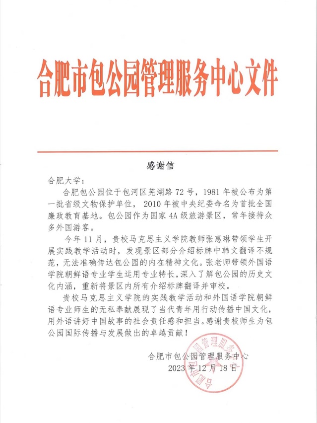 学生们通过此次活动,深刻感悟了包拯“孝忠、民本、刚正、清廉”的思想及中国传统文化内涵,但同时发现景区部分介绍标牌外文翻译不规范,无法准确传达其内在的精神文化。教师在与景区管理服务中心沟通后,引导学生运用专业特长,以包公园的深厚历史文化内涵为依托,重新将景区内所有介绍标牌翻译并请专家审校。12月18日,合肥包公园管理服务中心向日韩欧美福利视频_黑人巨大人精品欧美三区_欧美成人另类人妖_欧美在线精品一区二区三区_欧美一区二区三区性视频_日韩精品欧美视频_性欧美极品xxxx欧美一区二区发来感谢信,信中感谢马克思主义学院的实践教学活动和外国语学院朝鲜语专业师生的无私奉献,赞扬我校师生用行动传播中国文化,展现了当代青年用外语讲好中国故事的社会责任感和担当。 马克思主义学院领导表示将继续深入贯彻落实习近平总书记关于“大思政课”的重要指示,聚焦立德树人的根本任务,推动用党的创新理论铸魂育人,突出实践导向,充分调动全社会力量和资源,着力发挥校社联合的大平台作用,协力同行,谱写大学生实践教育高质量发展新篇章。(张惠琳/文图 苏冰/审核 武奎/编发) |