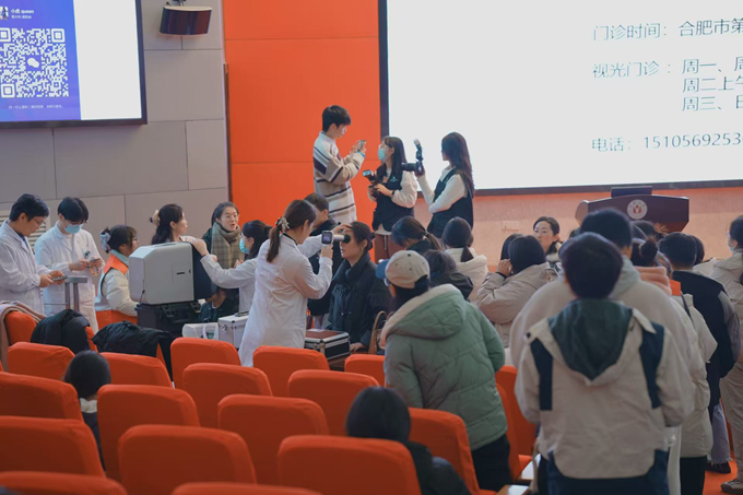 活动最后,合肥市第二人民医院的专业医疗人员还为到场的同学提供了免费的眼部健康检查服务。许多同学积极排队等待检测,并且主动向医生咨询自己关心的问题。