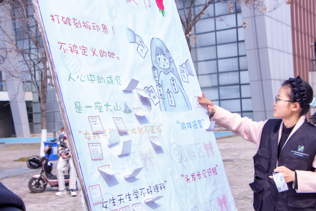 活动当天,工作人员提前做好准备,活动现场精心布置,吸引了众多师生驻足参与。活动利用展牌展示了当今社会中对女性的一些偏见和观念束缚。参与者们通过在便签上书写自己的想法并贴到展牌上,表达对自我的认同与支持。这种互动形式不仅让参与者得到温暖和鼓励,也为在场的每一个人带来了力量此外,活动现场还准备了丰富的文创礼品,进一步激发了师生们的参与热情。文创礼品与活动主题紧密结合,成为传播活动理念的载体,吸引了更多人关注女性权益与多元价值。