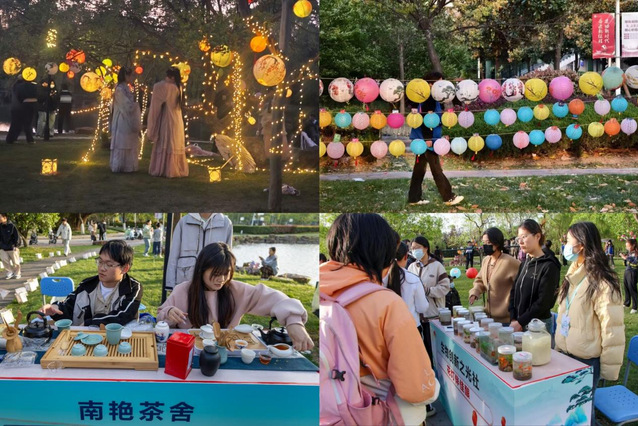 日暮西沉,一期湖畔渐次亮起万千灯火。电子爱好者协会以科技赋能传统,流光溢彩的电子花灯引人驻足;南艳茶舍前茶烟袅袅,学子们碾茶煮茗,体味晴窗细乳戏分茶的雅致;生物创新之光协会将酿酒古法融入节庆,花灯伴佳酿,暗香浮动月黄昏。灵心居手工社的巧手生花,ART手绘协会的妙笔丹青,无不展现着传统文化的当代活力。 月上柳梢时,猜灯谜、放河灯等传统活动将气氛推向高潮。盏盏明灯随波远去,载着学子们的美好祈愿;笑语欢声间,沙包投掷、寻宝探险等活动更添节庆趣味。湖光灯影两相和,一时多少诗意。