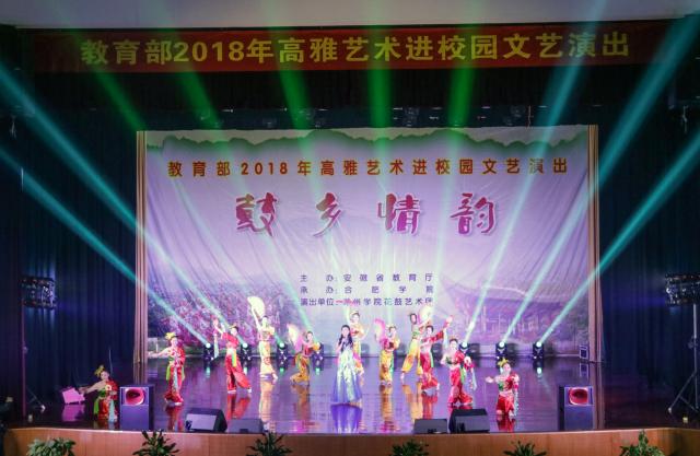 11月14日晚,由安徽省教育厅主办、合肥学院承办的“鼓乡情韵——高雅艺术进校园”在一区致用礼堂倾情上演。合肥学院党委委员、副校长刘建中,滁州学院党委常委、副校长吴开华,合肥学院团委书记杜娟,滁州学院音乐学院副院长彭钰,滁州学院团委副书记庚老师以及来自各系的一千多名同学观看了本场演出。本次活动以“高雅艺术进校园——鼓乡情韵”为主题展开,旨在陶冶学生情操,传播爱国主义思想。