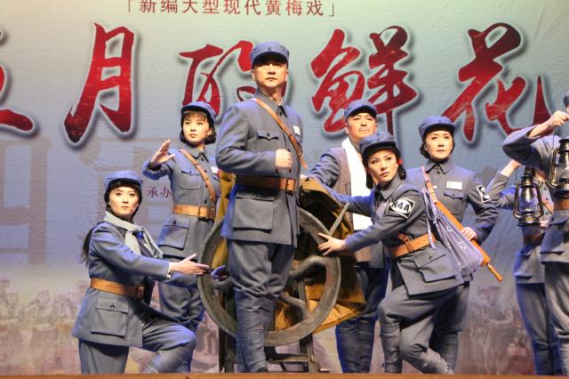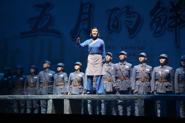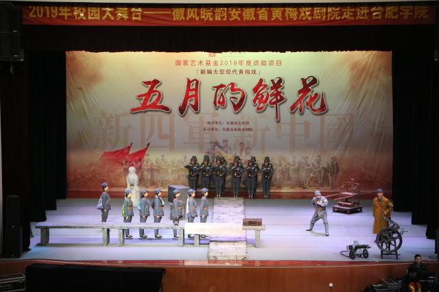 一声锣响,由安徽演艺集团创排出品的新编大型现代黄梅戏《五月的鲜花》拉开了表演的帷幕。运用传统乐器交响乐相结合的形式,汇聚众多国家级演员,采用精细讲究的舞台布置,才造就了《五月的鲜花》这一精品戏曲。全剧通过“约法三章”、“银圆风波”、“生死欠条”、“黎明托孤”、“江边话别”、“书院涅槃”等真实感人的戏剧场面,以顾重光、童华等一组新四军群像的塑造,让人们感受到那一代人身上的情感硬度和信仰纯度,昭示着中国共产党夺取全国胜利、走向辉煌的历史必然,兑换小分队谱写了一曲共产党人诚信如天的生命壮歌《五月的鲜花》把握了时代审美特征,体贴人民群众的审美选择,绚丽的舞美、创新的形式紧紧吸引住在场师生们的注意,现场掌声如潮。