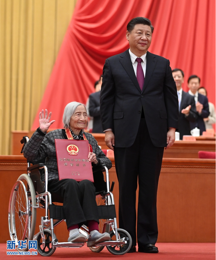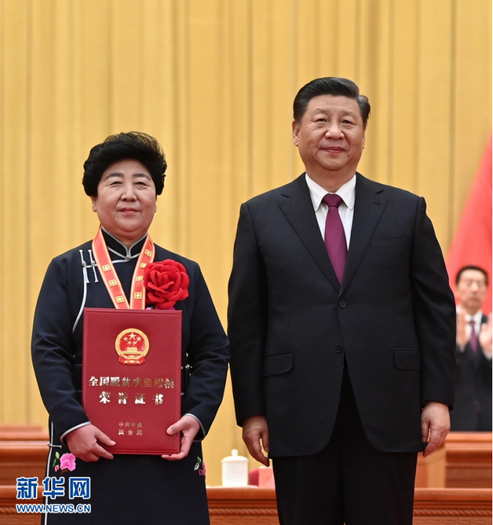 2月25日,全国脱贫攻坚总结表彰大会在北京人民大会堂隆重举行。这是习近平为全国脱贫攻坚楷模荣誉称号获得者李玉颁奖。新华社记者 李学仁 摄