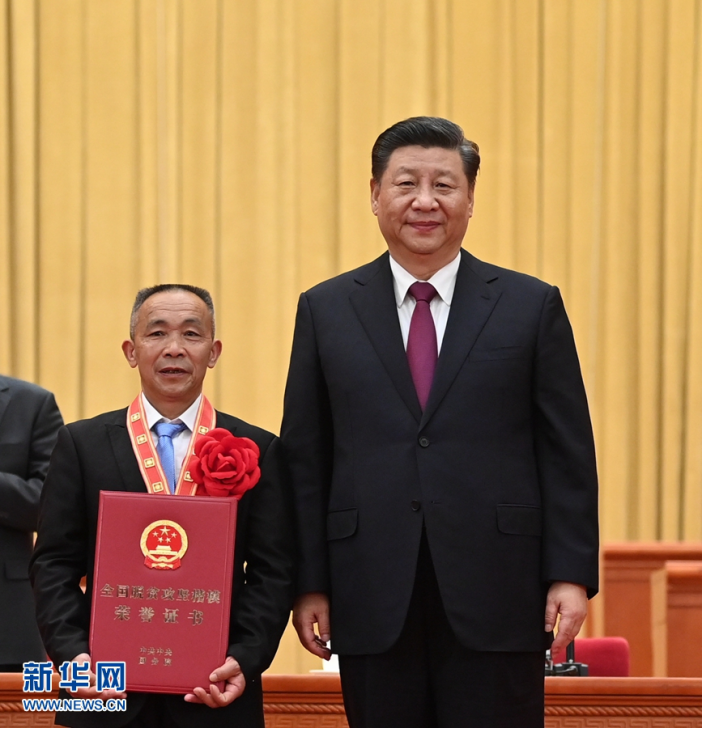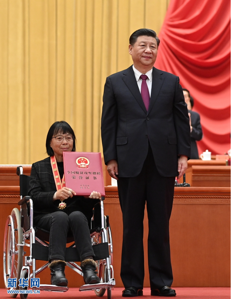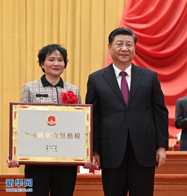 2月25日,全国脱贫攻坚总结表彰大会在北京人民大会堂隆重举行。这是习近平为全国脱贫攻坚楷模荣誉称号获得者安徽省金寨县花石乡大湾村颁奖。新华社记者 李学仁 摄