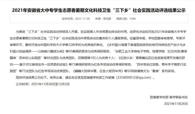 近日,安徽省大中专学生志愿者暑期文化科技卫生“三下乡”社会实践活动评选结果公示我校获评多项奖项,其中优秀团队2支,优秀调研报告4篇,优秀个人2名,在长三角高校大学生重走革命路专项中获得最美日记1篇。我校荣获优秀组织单位称号。