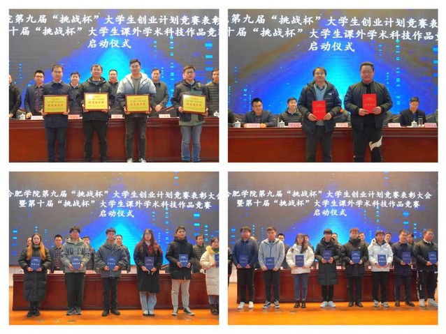 王玉代表合肥学院第九届“挑战杯”大学生创业计划竞赛组织委会简要汇报大赛组织工作。王晓峰宣读了《关于表彰合肥学院第九届“挑战杯”大学生创业计划竞赛获奖作品、优秀组织奖和优秀指导老师的决定》。与会领导们先后为优秀组织和优秀项目代表颁奖。朱涛宣读了《关于举办合肥学院第十届“挑战杯”大学生课外学术科技作品竞赛的通知》。
