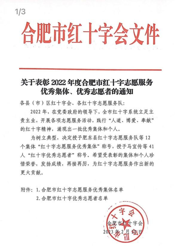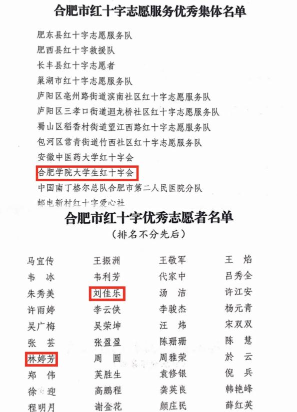 为树立典型,进一步践行“人道、博爱、奉献”的红十字精神,合肥市红十字会通报表彰了2022年度合肥市红十字志愿服务优秀集体及优秀志愿者,我校大学生红十字会荣获“合肥市红十字志愿服务优秀集体”称号,我校林婷芳和刘佳乐两位同学荣获“合肥市红十字优秀志愿者”称号。
