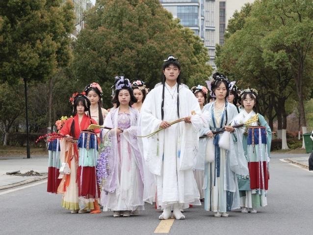 傍晚五点,汉服巡游开始。学生们身着各式汉服,手持兔子灯、绛纱灯,展示着“服章之美”。衣袂翩翩,宛若惊鸿,“越罗衫袂迎春风,玉刻麒麟腰带红”。举目之下满是温柔优雅的中国韵味,巡游队伍像一幅唯美的古典画卷。巡游途径35栋教学楼、图书馆、二期北小门、二期天桥、一期天桥、一期大门,最后到达表演场地艺术楼,在此进行了十二花神走秀和舞蹈表演。十二花神是中国花朝节的代表,正值春色满园,花神表演再合适不过。伴随着优美的旋律,精彩的汉服展演活动拉开了序幕,十二花神衣袂飘飘,华裳倩影,古韵盎然。紧接着是放河灯活动,五颜六色的莲花河灯放入湖面,灯光水影,交相辉映,如繁星点点,构成了一道美妙的校园夜景。社团摊位处还特别设置了书法、绘画、投壶、赏灯等活动,多元国风演绎环节也为同学们带来了别致体验。盛开的丁香与风雅端庄的汉服交相辉映,绘出了一幅校园三月春景图。